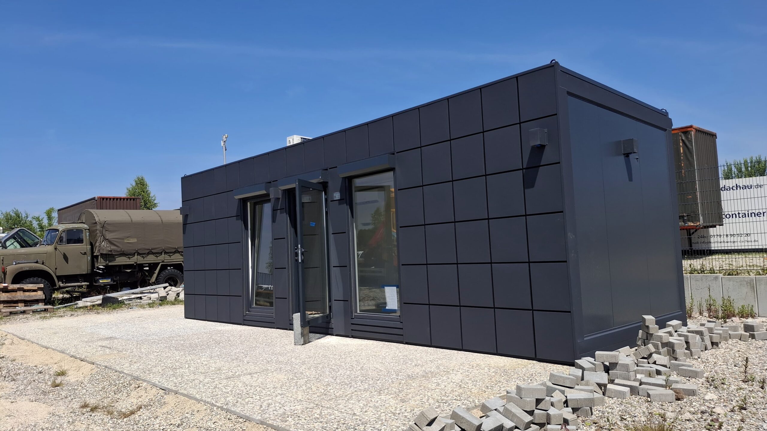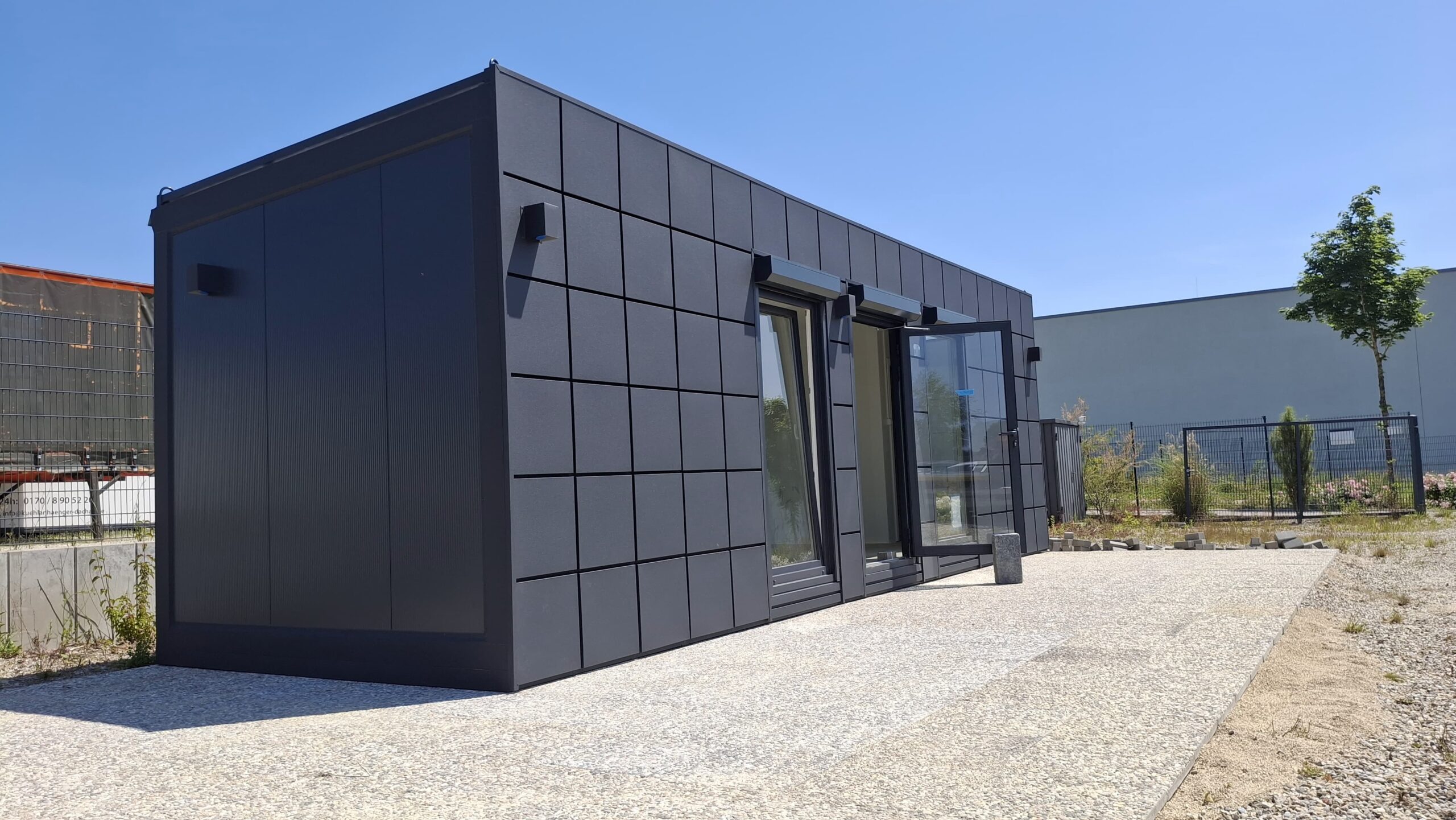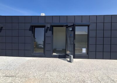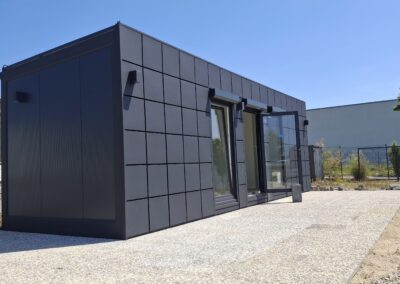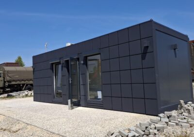 Der Pavillon besteht aus Sandwichelementen mit einem 100 mm dicken Schaumkern. Feuerhemmender Polystyrolschaum mit Feuerwiderstandsklasse E60 – Anthrazit (Graphit) RAL 7016 -. Das Polystyrol verbreitet kein Feuer mit der Feuerwiderstandsklasse E60: Außenfarbe RAL zu bestimmen.