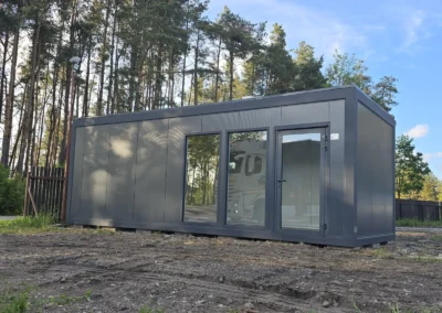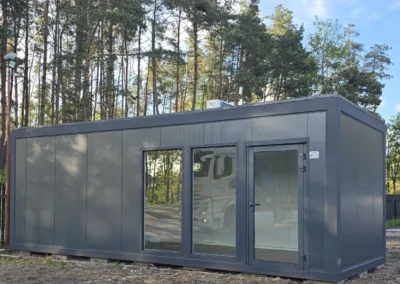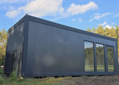 Der Pavillon besteht aus Sandwichelementen mit einem 100 mm dicken Schaumkern. Feuerhemmendes Polystyrolschaum mit Feuerwiderstandsklasse E60 – RAL 7016 Anthrazit (Graphit) – Styropor nicht brandausbreitend mit Feuerwiderstandsklasse E60: RAL-Außenfarbe zu bestimmen.