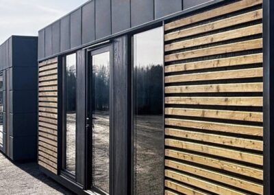 Der Pavillon besteht aus Sandwichelementen mit einem 100 mm dicken Schaumkern. Feuerhemmendes Polystyrolschaum mit Feuerwiderstandsklasse E60 – RAL 7016 Anthrazit (Graphit) – Styropor nicht brandausbreitend mit Feuerwiderstandsklasse E60: RAL-Außenfarbe zu bestimmen.