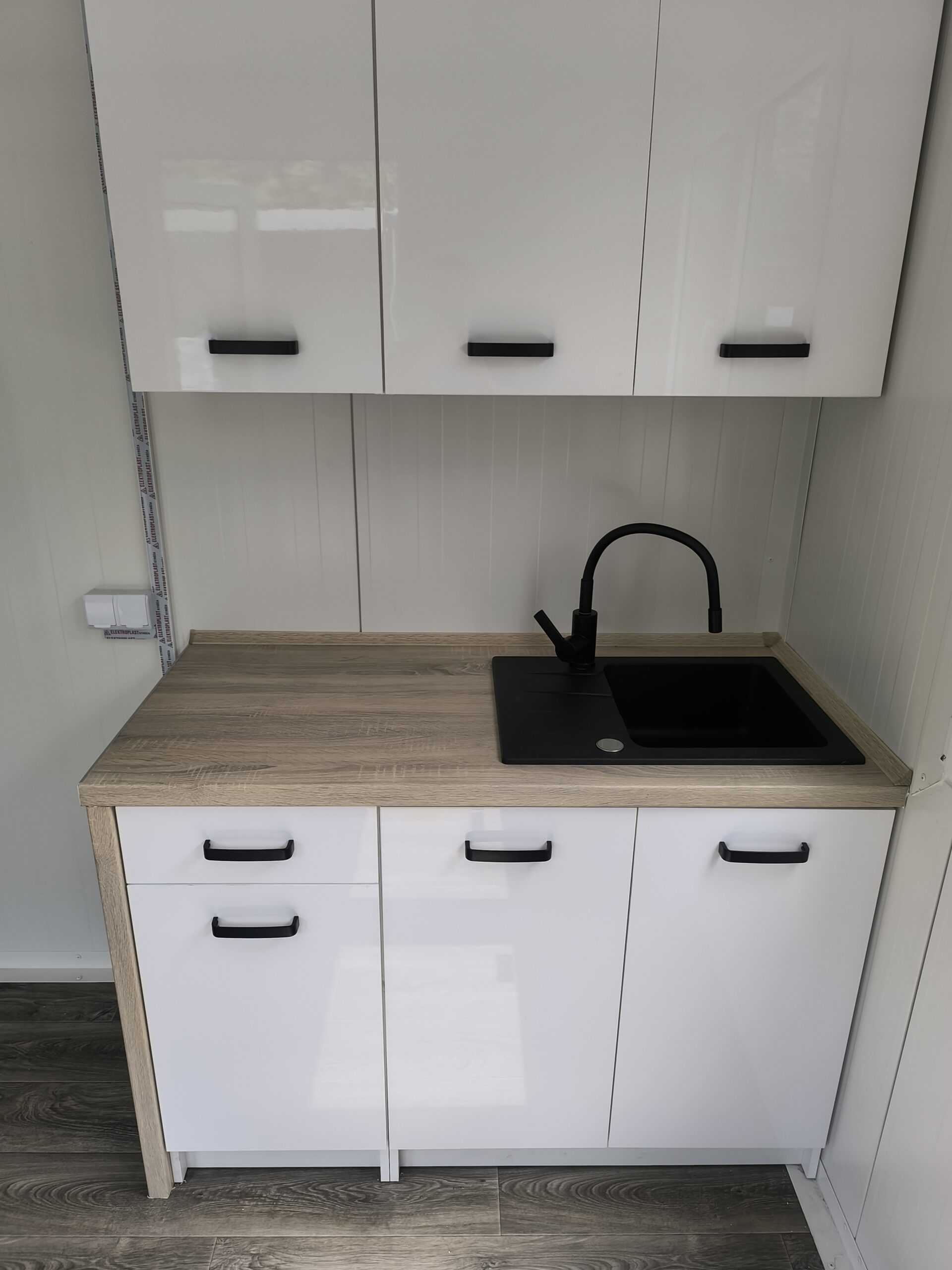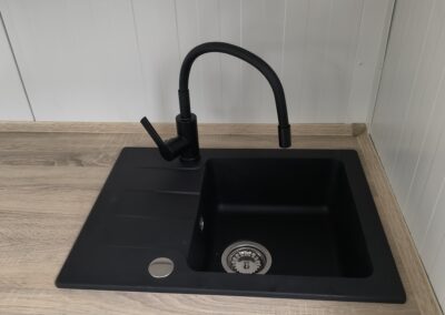 899 euro netto Miniküche mit Wasserhahn, Spüle und im Tisch versteckter Warmwasserbereitung – graue Hochglanztische